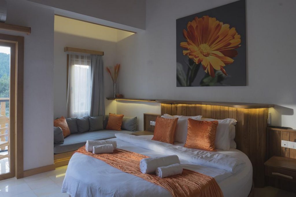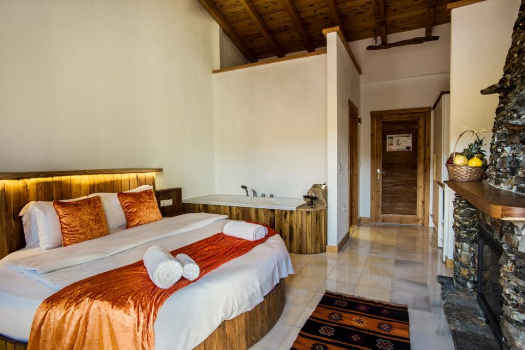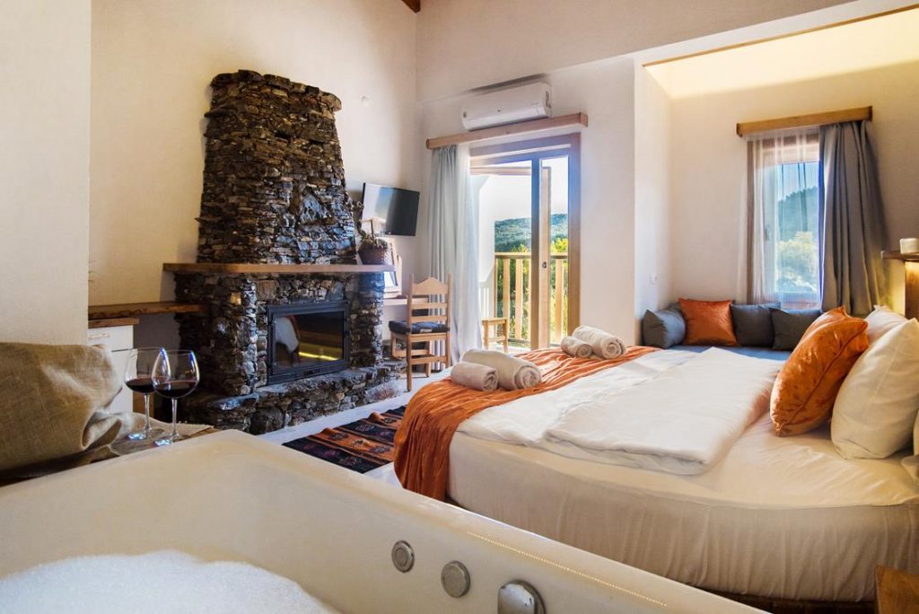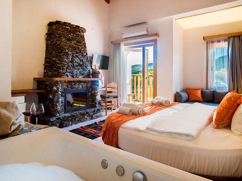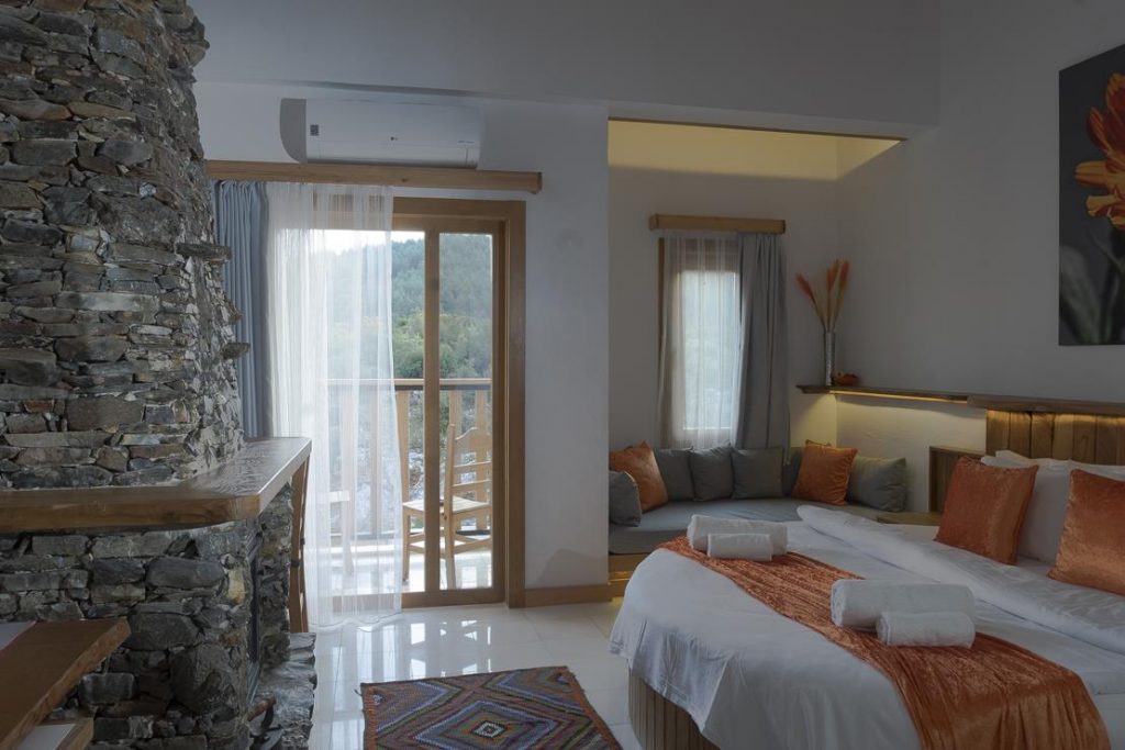Deluxe Jakuzili ve Şömineli Oda, dağ manzaralı geniş balkonlu bir odadır.